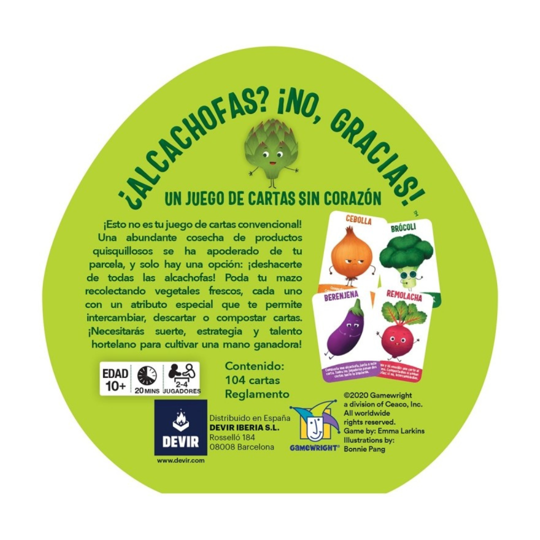 En tu huerto han crecido un montón de alcachofas… ¡Y debes librarte de ellas! Para recolectar la victoria en ¿Alcachofas? ¡No, gracias! deberás podar tus cartas hasta que solo te queden las verduras más frescas y sabrosas. Utilizarás los poderes de patatas, berenjenas, cebollas o zanahorias para intercambiar, descartar o compostar las alcachofas de tu mano. Este juego de creación y gestión de mazos, galardonado con el premio al Mejor Juego de Iniciación de 2021 en los American Tabletop Awards, promete haceros cosechar horas de diversión.