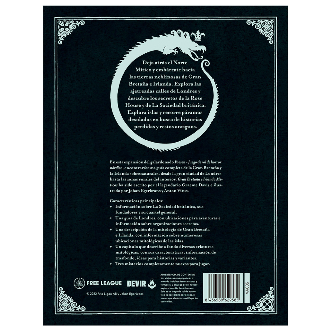 En esta expansión del galardonado Vaesen – Juego de rol de horror nórdico, encontrarás una guía completa de la Gran Bretaña y la Irlanda sobrenaturales, desde la gran ciudad de Londres hasta las zonas rurales del interior. Gran Bretaña e Irlanda Míticas ha sido escrito por el legendario Graeme Davis e ilustrado por Johan Egerkrans y Anton Vitus.