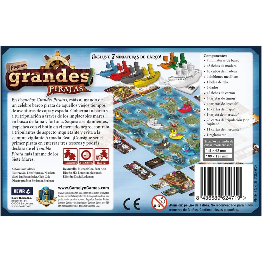 Esta es la reseña de Pequeños grandes piratas, juego de mesa tipo “euro” de Devir, para jugar a partir de 12-14 años, de 1 a 4 jugadores. Forma parte de la serie de juegos “Pequeños grandes…”, que tiene otros títulos con diferentes temáticas.