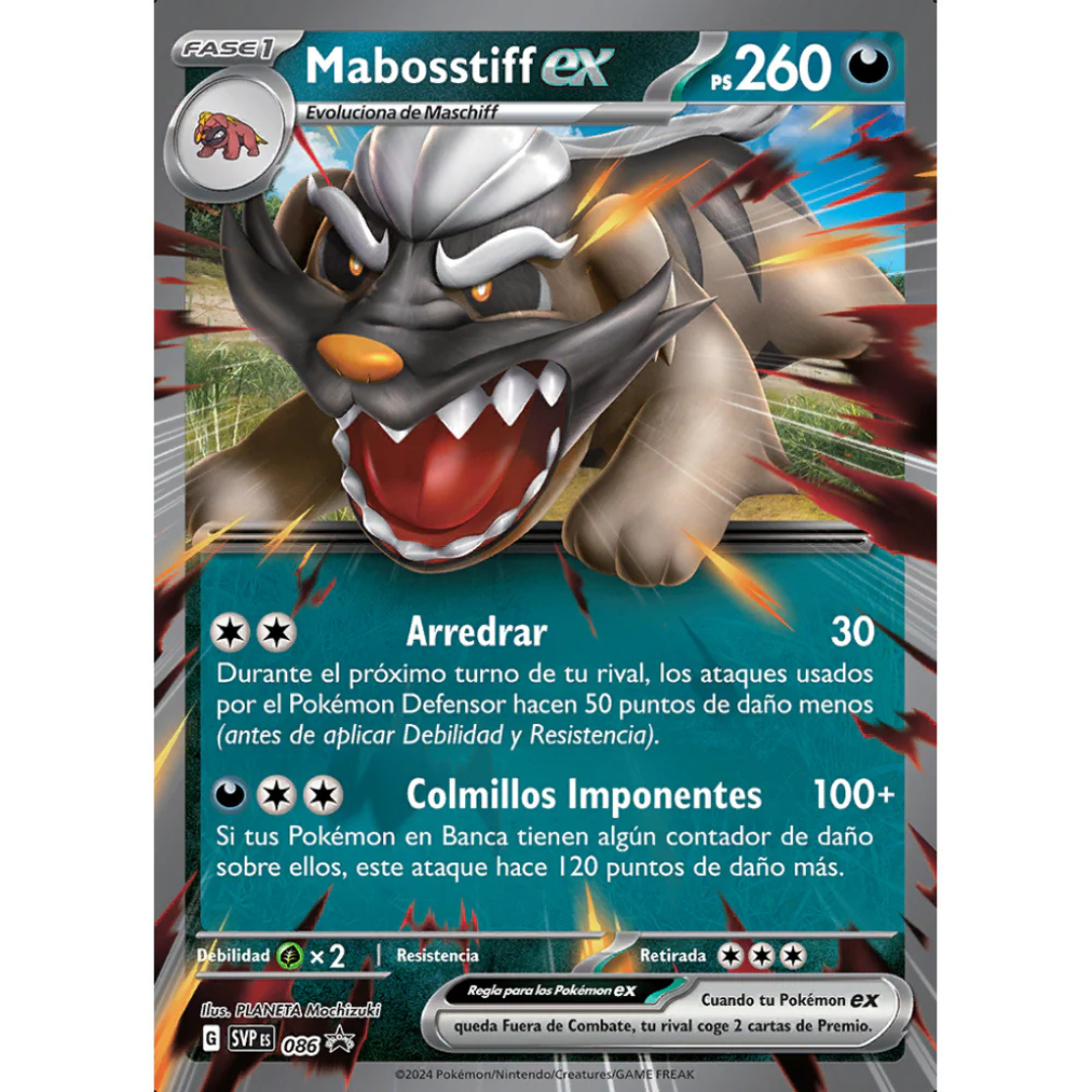 «Mabosstiff normalmente es afable, pero, cuando ha de proteger a sus aliados, adopta un aspecto amenazante. Une tus fuerzas a las de este fiel Pokémon y asesta un golpe feroz a tus rivales. Aquí encontrarás a Mabosstiff ex en forma de carta holográfica de promoción, junto con tres paquetes de mejora de JCC Pokémon.»