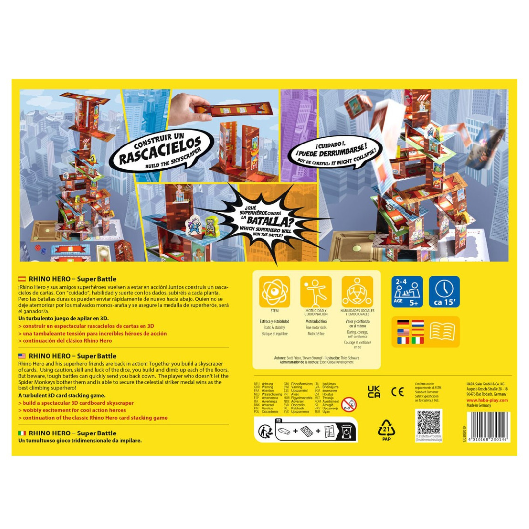 Rhino Hero y sus amigos superhéroes viven infinidad de aventuras en el rascacielos de cartas. Pero, cuidado, porque el rascacielos es cada vez más alto e inestable a medida que se le van añadiendo cartas. El que tire el dado con habilidad, mueve a sus superhéroes hacia arriba y defiende su lugar en las batallas contra otros jugadores… si no fuese por los monos-araña, que hacen tambalear el rascacielos.