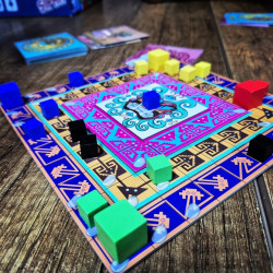 En este juego no existe dado, solo las piezas cubicas que serán tus guerreros y líder de tribu, y unas cartas que irás ganando a medida que vayas quedándote sin piezas; pero ¡CUIDADO!, que el uso de estas cartas de poder harán que un medidor avance silenciosamente, y al llegar a ciertas posiciones, los pisos del tablero piramidal se inundarán, reduciendo el área de juego, y eliminando a las piezas que se encuentren en ella.