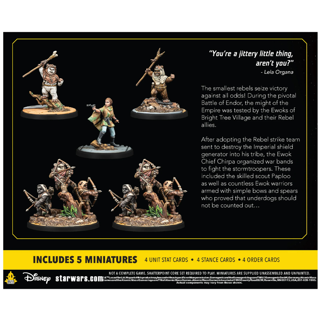 ¡Los rebeldes más pequeños logran la victoria contra todo pronóstico! Durante la decisiva batalla de Endor, el poder del Imperio fue puesto a prueba por los ewoks de la Aldea del Árbol Brillante y sus aliados rebeldes. Tras aceptar en su tribu al equipo de asalto rebelde enviado a destruir el generador del escudo imperial, el jefe ewok Chirpa organizó bandas de guerreros para combatir a los soldados de asalto. En estas bandas lucharon el hábil explorador Paploo y numerosos guerreros ewoks armados con simples arcos y lanzas, quienes demostraron que no hay enemigo pequeño…
