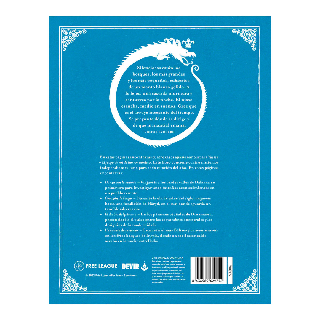 En estas páginas encontrarás cuatro casos apasionantes para Vaesen – El juego de rol de horror nórdico. Este libro contiene cuatro misterios independientes, uno para cada estación del año.